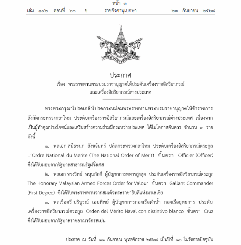 วันที่ 24 กันยายน 2568 เว็บไซต์ ราชกิจจานุเบกษา เผยแพร่ พระบรมราชโองการ ประกาศ เรื่อง พระราชทานพระบรมราชานุญาตให้ประดับเครื่องราชอิสริยาภรณ์และเครื่องอิสริยาภรณ์ต่างประเทศ จำนวน 3 ราย