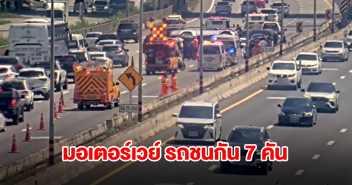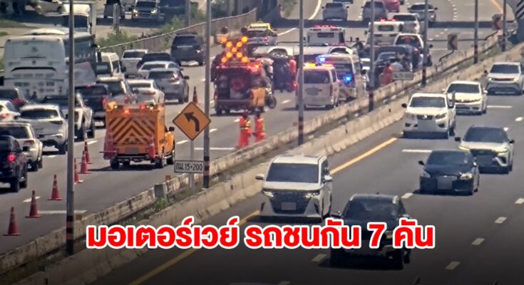 รถชนสนั่น 7 คันรวด บนมอเตอร์เวย์ รถติดยาว 8 กม. เร่งเคลื่อนย้ายกระบะตะแคงขวาง