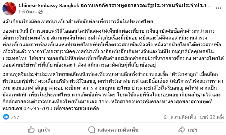เมื่อวันที่ 15 ตุลาคม 2568 สถานเอกอัครราชทูตสาธารณรัฐประชาชนจีนประจำประเทศไทย ได้ออกมาประกาศแจ้งเตือนเรื่องมัคคุเทศก์นำเที่ยวสำหรับนักท่องเที่ยวชาวจีนในประเทศไทย ผ่านเพจเฟซบุ๊ก Chinese Embassy Bangkok สถานเอกอัครราชทูตสาธารณรัฐประชาชนจีนประจำประเทศไทย โดยระบุว่า สองสามวันนี้ มีการเผยแพร่วิดีโอออนไลน์ที่แสดงให้เห็นนักท่องเที่ยวชาวจีนถูกบังคับซื้อสินค้าระหว่างการเดินทางในประเทศไทย