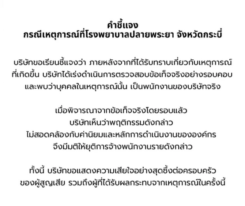 ทั้งนี้ บริษัทขอแสดงความเสียใจอย่างสุดซึ้งต่อครอบครัวของผู้สูญเสีย รวมถึงผู้ที่ได้รับผลกระทบจากเหตุการณ์ในครั้งนี้