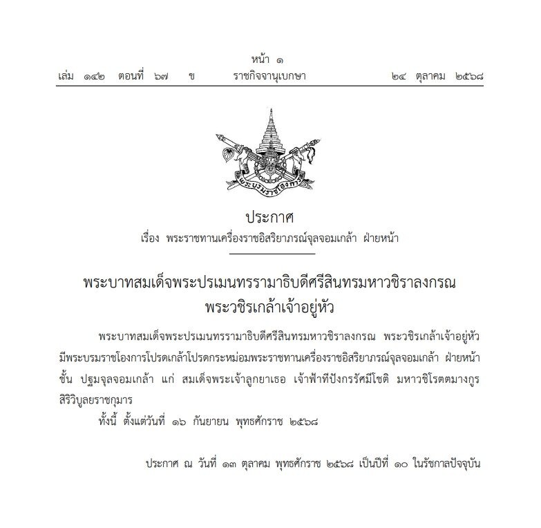 วันที่ 25 ต.ค.2568 ผู้สื่อข่าวรายงานว่า เว็บไซต์ ราชกิจจานุเบกษา เผยแพร่ประกาศ เรื่อง พระราชทานเครื่องราชอิสริยากรณ์จุลจอมเกล้า ฝ่ายหน้า ความว่า