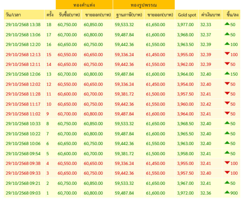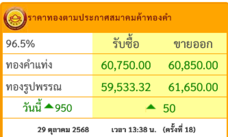 ราคาทองคำ วันที่ 29 ตุลาคม 2568 13:38 น. (ครั้งที่ 18)