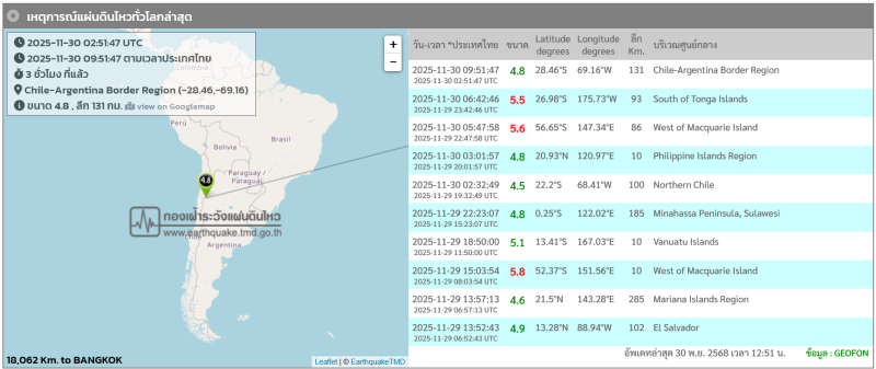 30 พ.ย. 68 เหตุการณ์แผ่นดินไหวภายในประเทศและใกล้เคียงล่าสุด