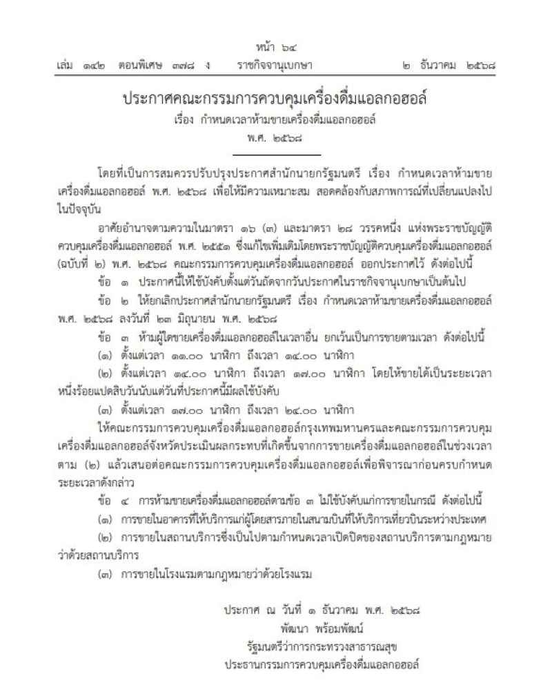 วันที่ 3 ธันวาคม 2568 รายงานว่า เว็บไซต์ราชกิจจานุเบกษาได้เผยแพร่ประกาศคณะกรรมการควบคุมเครื่องดื่มแอลกอฮอล์ เรื่องกำหนดเวลาห้ามขายเครื่องดื่มแอลกอฮอล์ พ.ศ.2568 ซึ่งเป็นการปรับปรุงประกาศเดิมของสำนักนายกรัฐมนตรีให้สอดคล้องกับสถานการณ์ปัจจุบัน