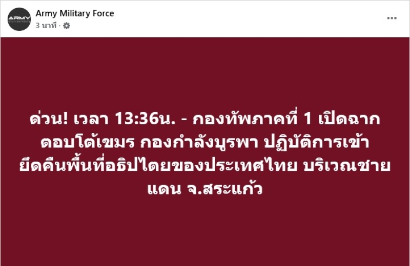 วันที่ 8 ธ.ค. 68 ทางเพจ Army Military Force ด่วน! เวลา 13:36น. – กองทัพภาคที่ 1 เปิดฉากตอบโต้เขมร กองกำลังบูรพา ปฏิบัติการเข้ายึดคืนพื้นที่อธิปไตยของประเทศไทย บริเวณชายแดน จ.สระแก้ว