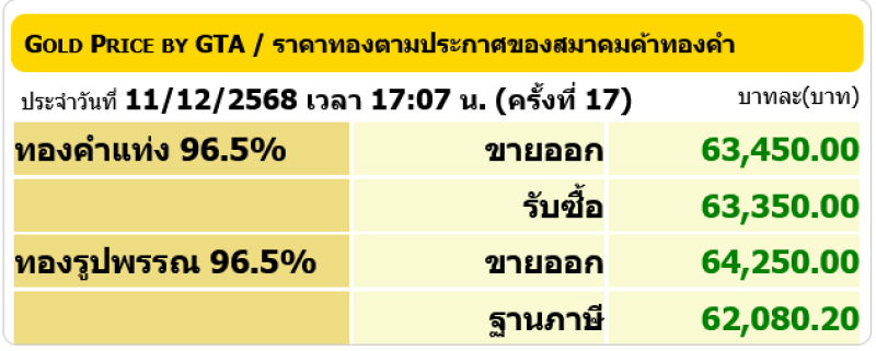 สำหรับราคาทองคำเปิดตลาดประจำวันที่ 11 ธันวาคม 2568 เปิดตลาดปรับขึ้น 300 บาท ในครั้งที่1 ต่อมามีการปรับขึ้น-ลง รวมแล้ว 17 ครั้ง โดยทองรูปพรรณขายออกบาทละ 64,250 ตามข้อมูลจากเว็บไซต์ของ สมาคมค้าทองคำ เมื่อเวลา 17.07 น.