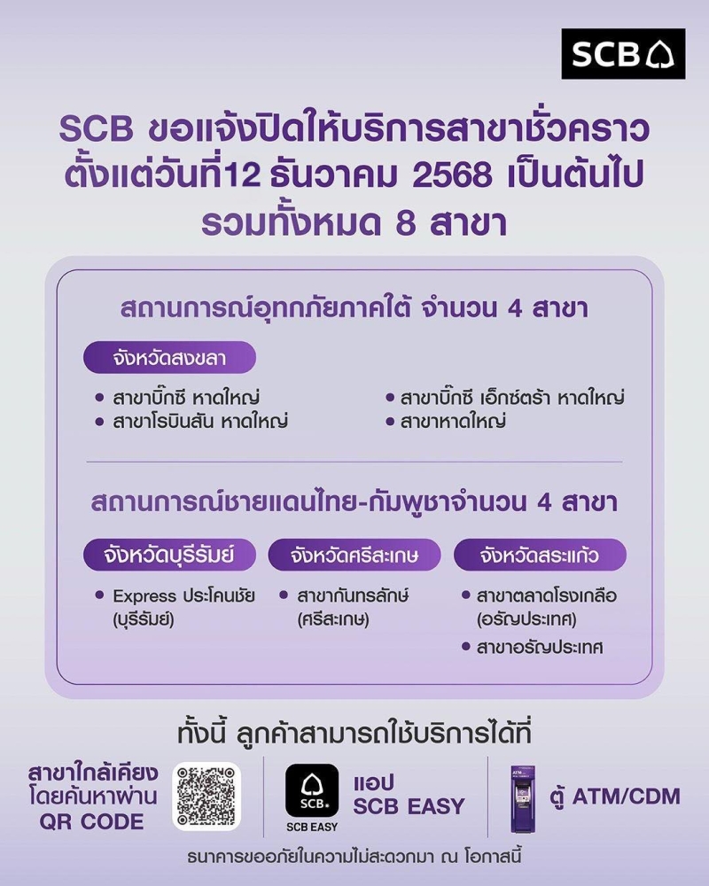 จากกรณี เพจ SCB Thailand ได้ออกมาโพสต์ถึงลูกค้าโดยระบุว่า ธนาคารไทยพาณิชย์ ขอแจ้งปิดสาขาชั่วคราว เนื่องจากสถานการณ์น้ำท่วมในพื้นที่ภาคใต้ และสถานการณ์ชายแดนไทย-กัมพูชา ตั้งแต่วันที่ 12 ธันวาคม 2568 เป็นต้นไป