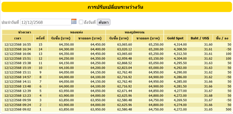 สำหรับราคาทองคำเปิดตลาดประจำวันที่ 12 ธันวาคม 2568 เปิดตลาดปรับขึ้น 500 บาท ในครั้งที่1 ต่อมามีการปรับขึ้น-ลง รวมแล้ว 15 ครั้ง โดยทองรูปพรรณขายออกบาทละ 65,250 ตามข้อมูลจากเว็บไซต์ของ สมาคมค้าทองคำ เมื่อเวลา 16.55 น.
