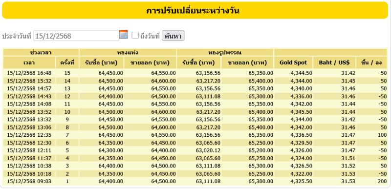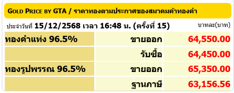 สำหรับราคาทองคำเปิดตลาดประจำวันที่ 15 ธันวาคม 2568 เปิดตลาดปรับขึ้น 200 บาท ในครั้งที่1 ต่อมามีการปรับขึ้น-ลง รวมแล้ว 15 ครั้ง โดยทองรูปพรรณขายออกบาทละ 65,350 ตามข้อมูลจากเว็บไซต์ของ สมาคมค้าทองคำ เมื่อเวลา 16.48 น.