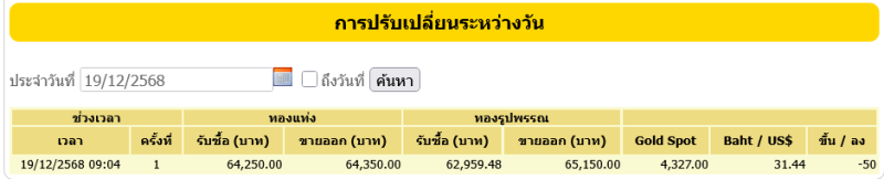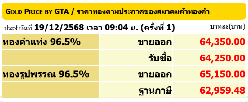 สำหรับราคาทองคำเปิดตลาดประจำวันที่ 19 ธันวาคม 2568 เปิดตลาดปรับลง 50 บาท ในครั้งที่1 โดยทองรูปพรรณขายออกบาทละ 65,150 ตามข้อมูลจากเว็บไซต์ของ สมาคมค้าทองคำ เมื่อเวลา 09.04 น.