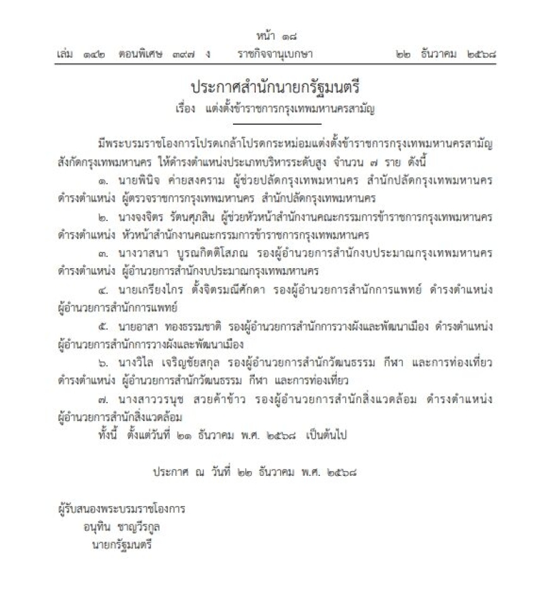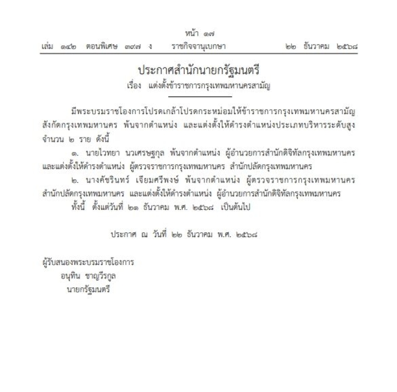 ทั้งนี้ ตั้งแต่วันที่ 21 ธ.ค.68 เป็นต้นไป ผู้รับสนองพระบรมราชโองการ นายอนุทิน ชาญวีรกูล นายกรัฐมนตรี