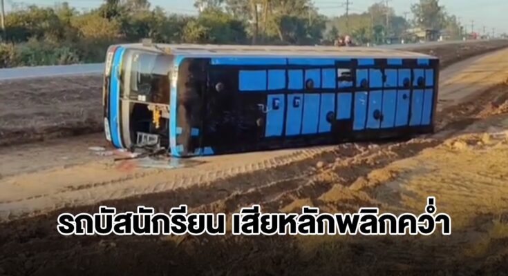 รถบัสรับ-ส่งนักรียน เสียหลักพลิกคว่ำลงข้างทาง